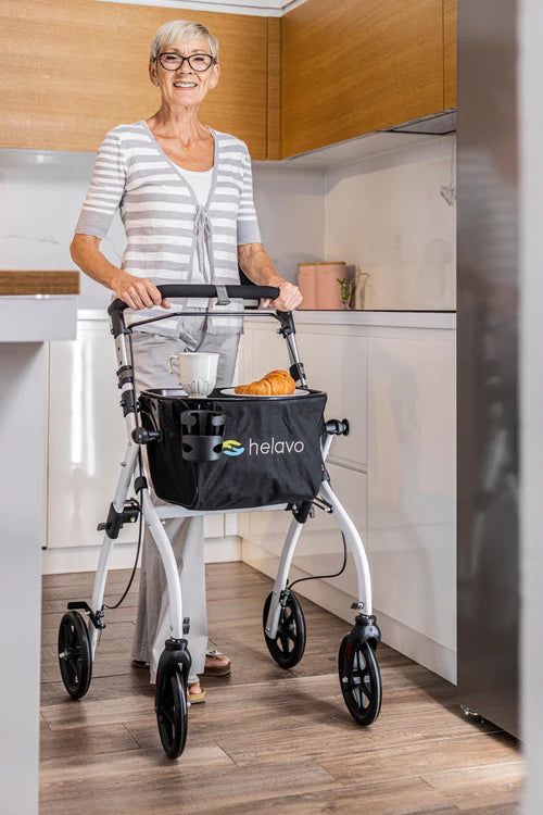 The Helavo H1040 rollator is the ideal choice for those who don’t want to forgo mobility outdoors. With its robust aluminum frame and air-filled tires, it offers maximum comfort and stability on uneven terrain. The ergonomic handles are height-adjustable, allowing for personalized fitting based on your height. Thanks to the simple folding mechanism, the rollator can be stored and transported in a space-saving way. With a load capacity of up to 136 kg and a comfortable seat with backrest, the H1040 is a reliable companion for active individuals who value quality and functionality.